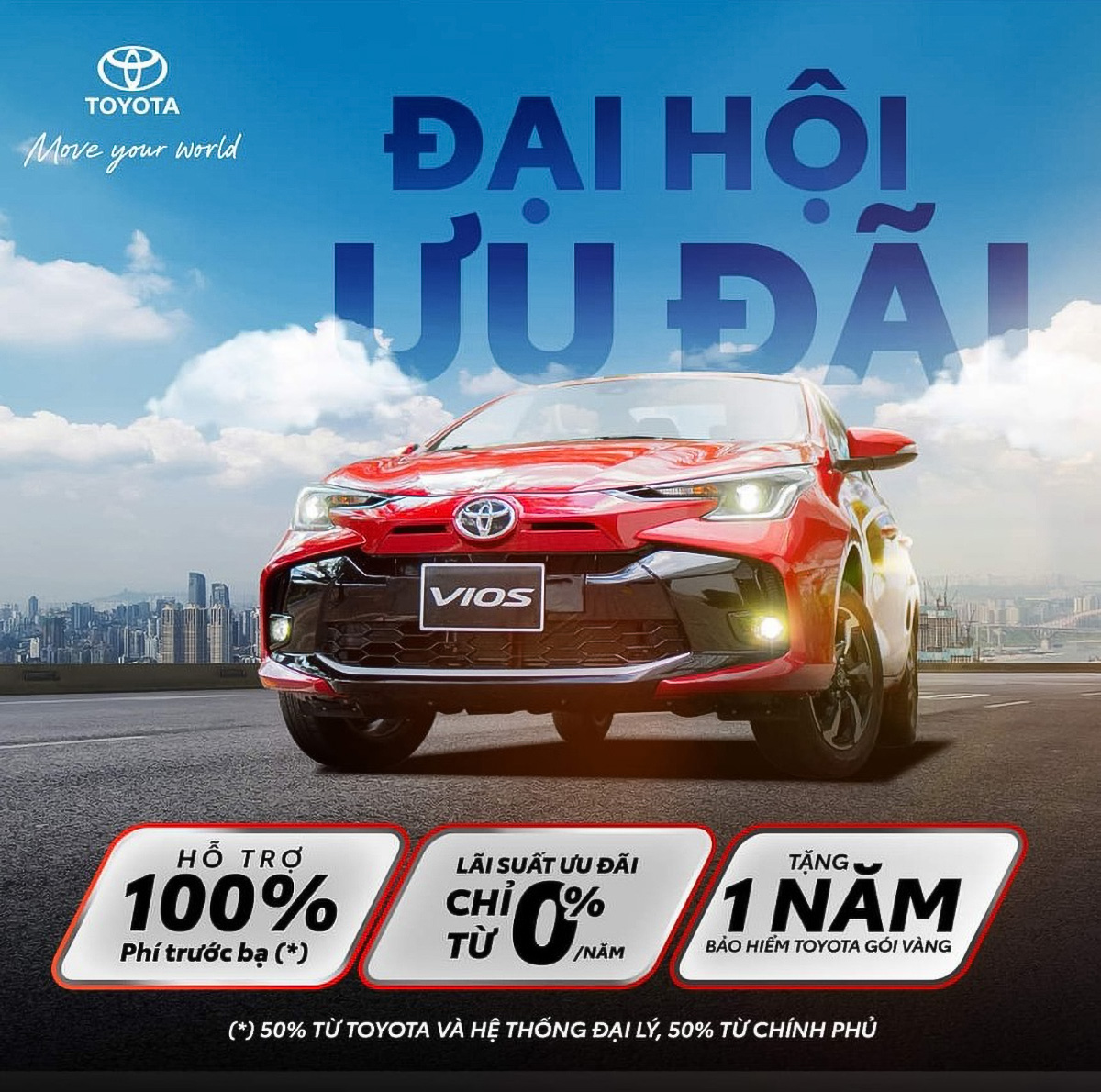 – Đặc biệt nếu bạn dự định mua Vios, hãy nhanh tay “chốt đơn” để nhận ngay Hỗ trợ 100% Lệ phí trước bạ (50% từ Toyota và các Đại lý, 50% từ Chính phủ) và quà tặng 01 năm Bảo hiểm Toyota Gói vàng cho những trải nghiệm an toàn vượt trội. Chưa hết, chỉ cần trả trước 72 triệu đồng, bạn có thể rước ngay xe về nhà.